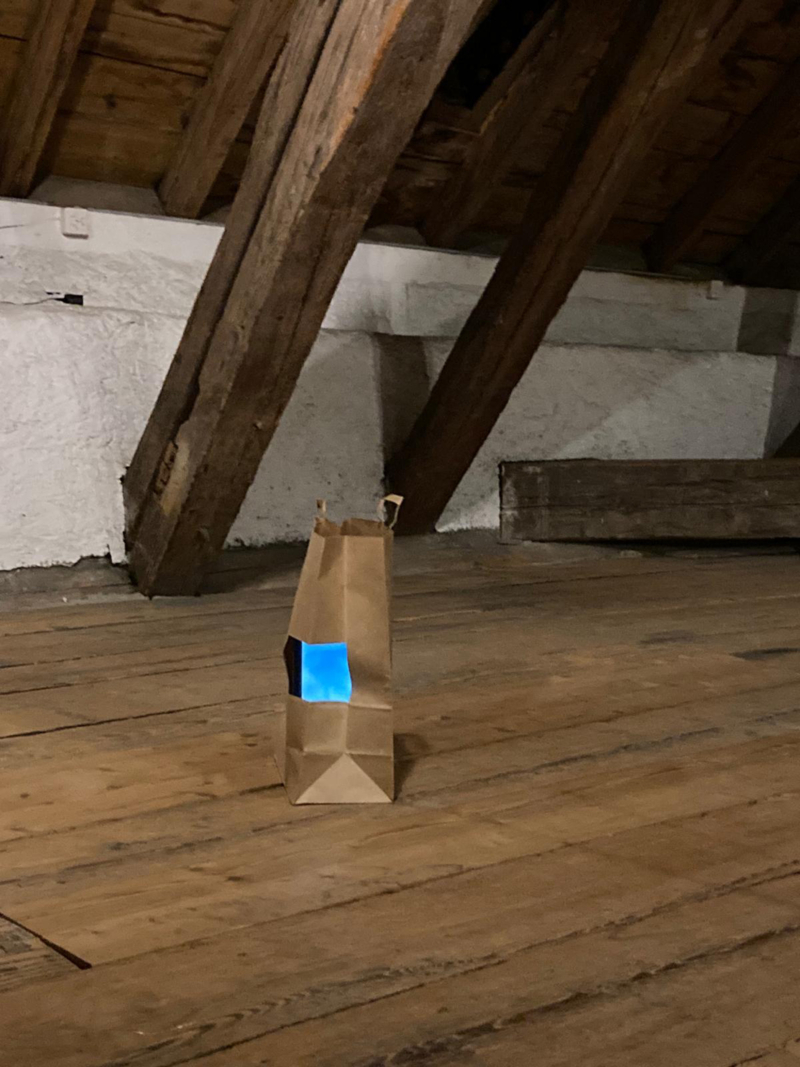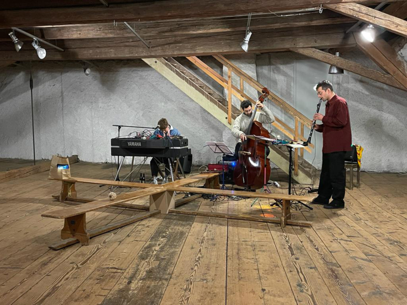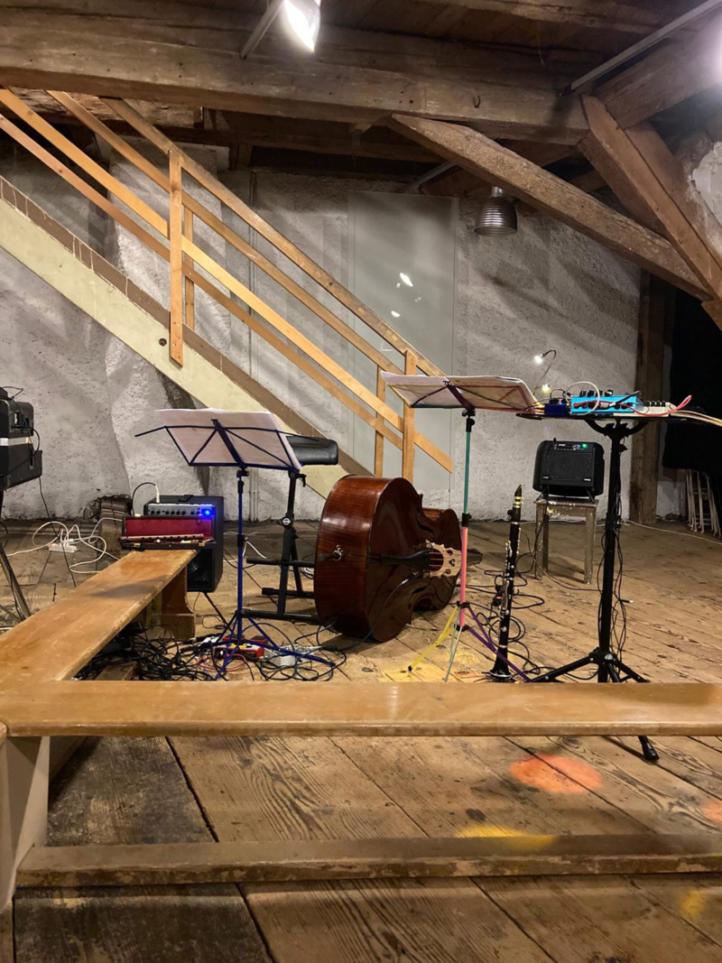 In the attic of KRONE COURONNE artist Gabriel Stöckli showed some of his latest works: Senza titolo [Untitled] (2023) is a series of sound sculptures that the artist conceived during his residency at Cité internationale des arts in Paris earlier this year. They are inspired, like many of Stöckli’s works, by the daily observation of his surroundings and their slow absorption. Domestic life, conviviality, irony, human intelligence – some of the issues that interest him the most – have been circumscribed, synthesized and returned in a new, unusual context. Taking inspiration from two sound sculptures by Gabriel Stöckli, musicians Marco Guglielmetti, Paul Pedrazzini and Matteo Simonin performed live on this evening. They started playing to the soundtrack of the sculpture Dream Operator, overlapping with it and then presented other compositions. There were snacks & beer during and following the concert.