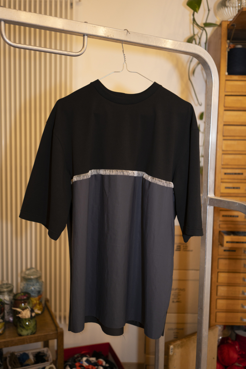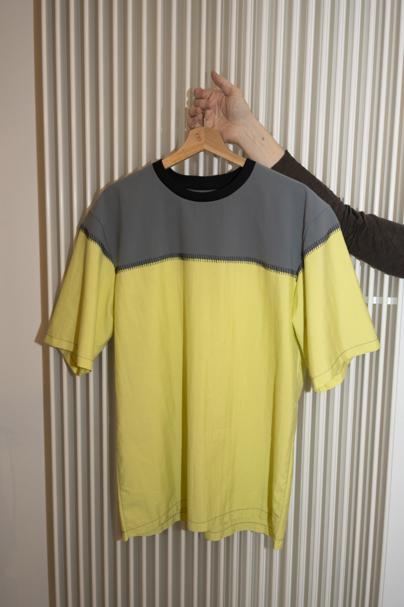 For this occasion, artist Thomas Julier collaborated with fashion designer Adriana Quaiser to design and manufacture a limited edition of T-shirts using deadstock fabric – unsold fabric produced for a particular purpose but never utilized – sourced from various places. The design placed particular emphasis on the shape, cut, and the seams of the T-shirts, denoting the space where different textiles meet and engage in dialogue through material qualities, textures, and colors. The T-shirts are conceived as wearables and soft sculptures alike.